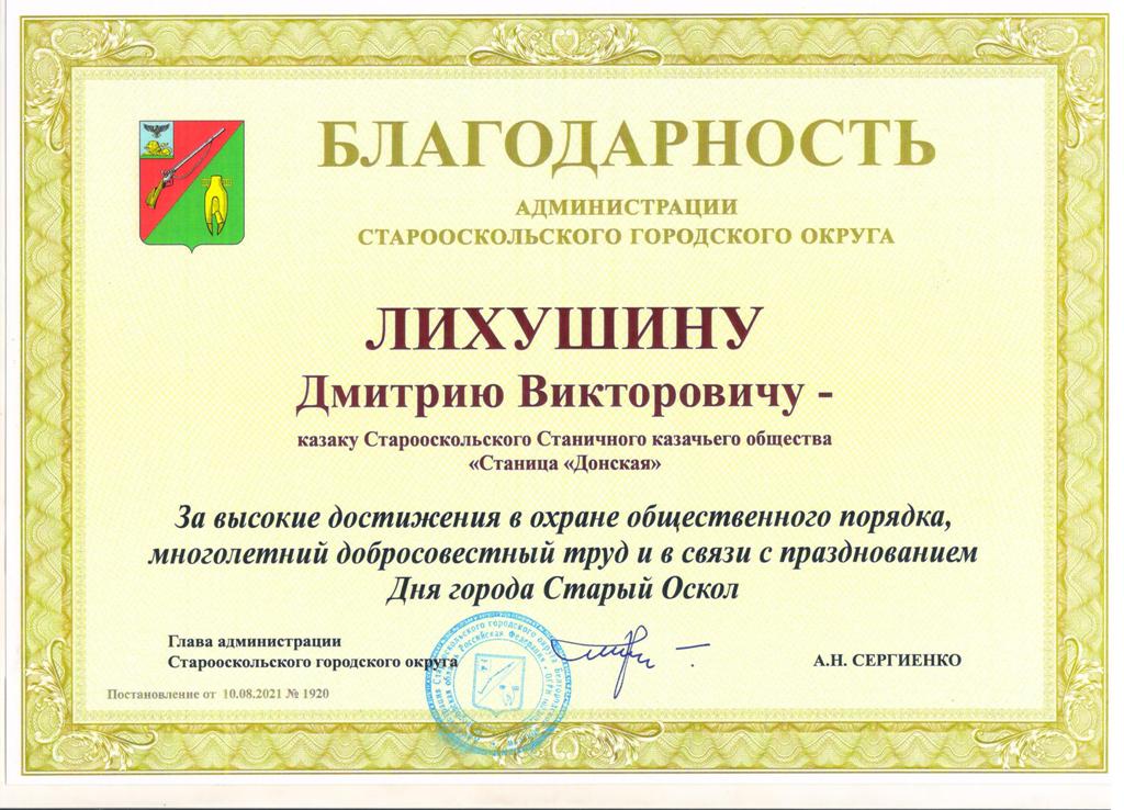 Благодарностью главы администрации Старооскольского городского округа были награждены также казаки Станицы «Донская» Лихушин Дмитрий и Симонов Игорь.