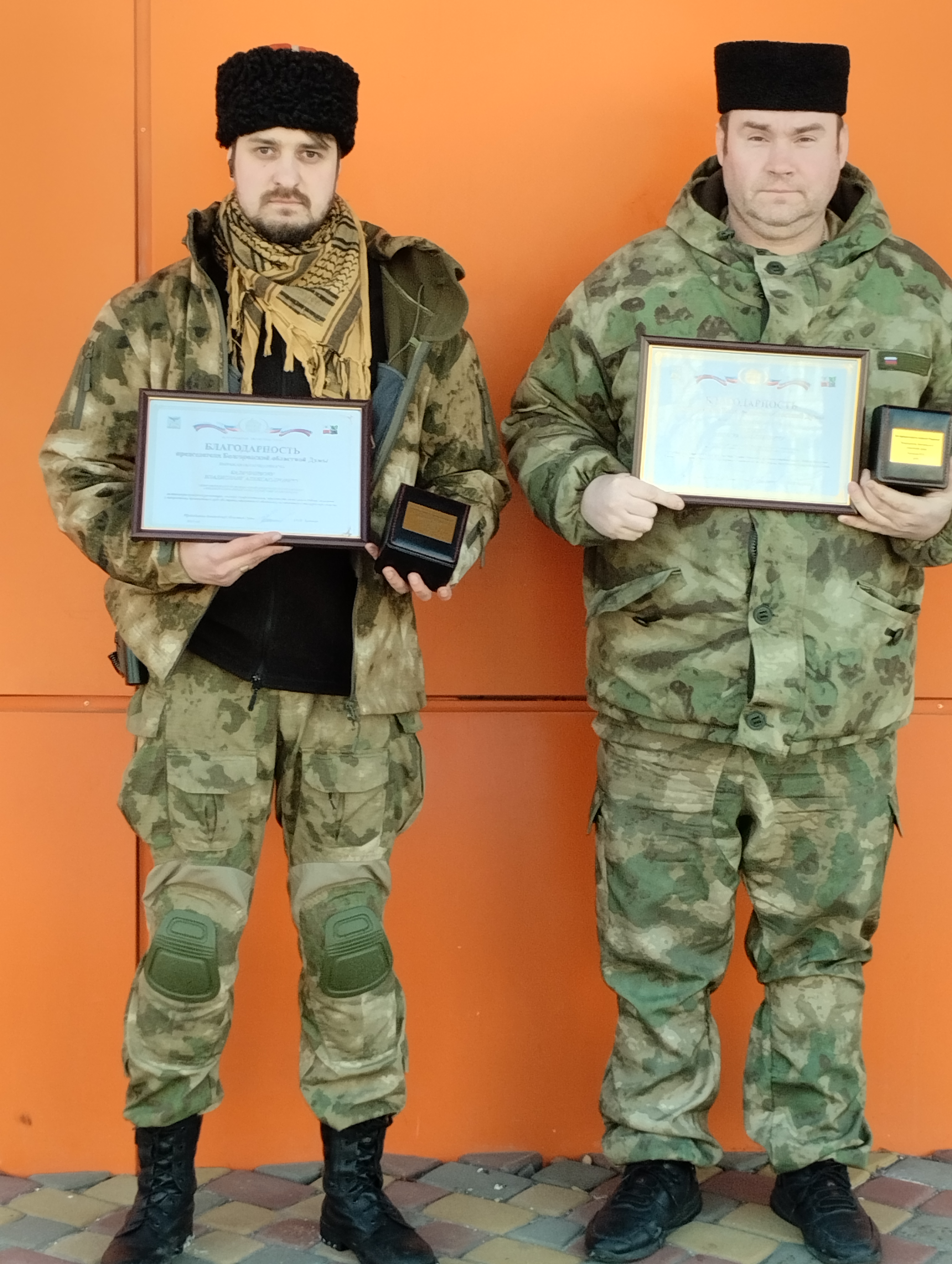 13 февраля в преддверии Дня защитника отечества два казака Старооскольского Станичного казачьего общества «Станица «Донская» Алексей Голдаев и Владислав Кадочников награждены Благодарностью председателя Белгородской областной Думы Клепикова Ю.Н. «за активную гражданскую позицию, высокий профессионализм, преданность своей малой Родине, мужество и патриотизм, проявленные в ходе обострения оперативной обстановки на территории Белгородской области» и ценным подарком (часами).