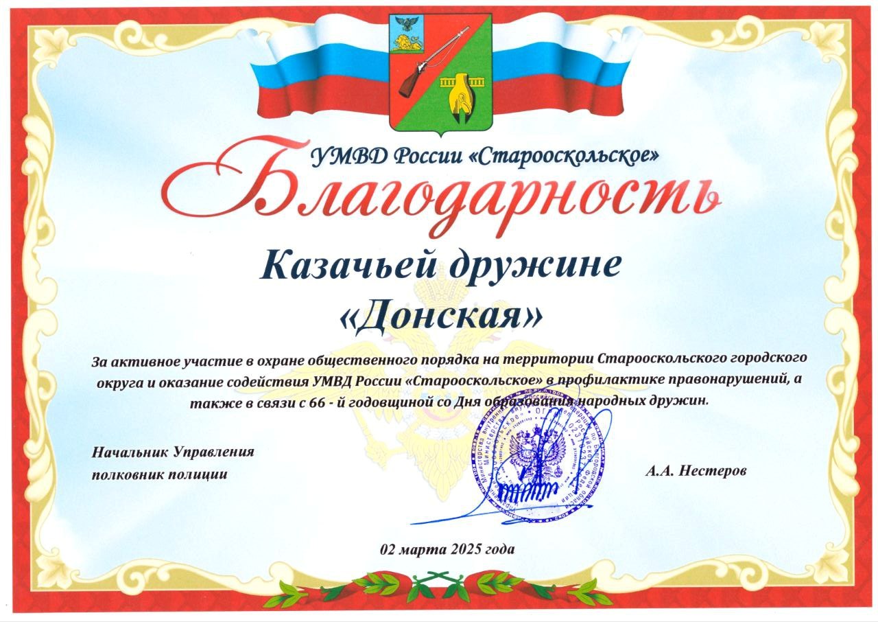 1. Почетной грамотой Администрации Старооскольского городского округа:Командир ДКД «Донская» Назаренко В.В.(казачий полковник -Атаман ССКО "Станица "Донская")